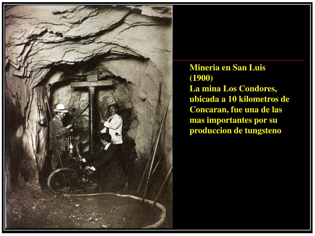 Mineria en San Luis (1900) La mina Los Condores, ubicada a 10 kilometros de Concaran, fue una de las mas importantes por su produccion de tungsteno