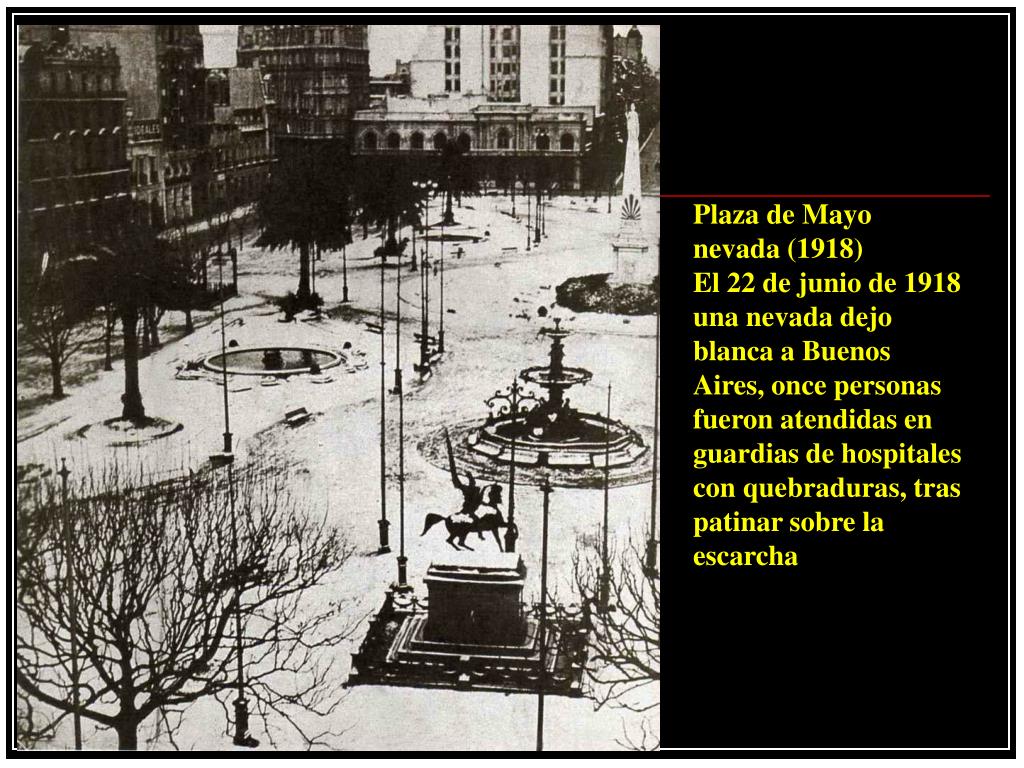 Plaza de Mayo nevada (1918) El 22 de junio de 1918 una nevada dejo blanca a Buenos Aires, once personas fueron atendidas en guardias de hospitales con quebraduras, tras patinar sobre la escarcha