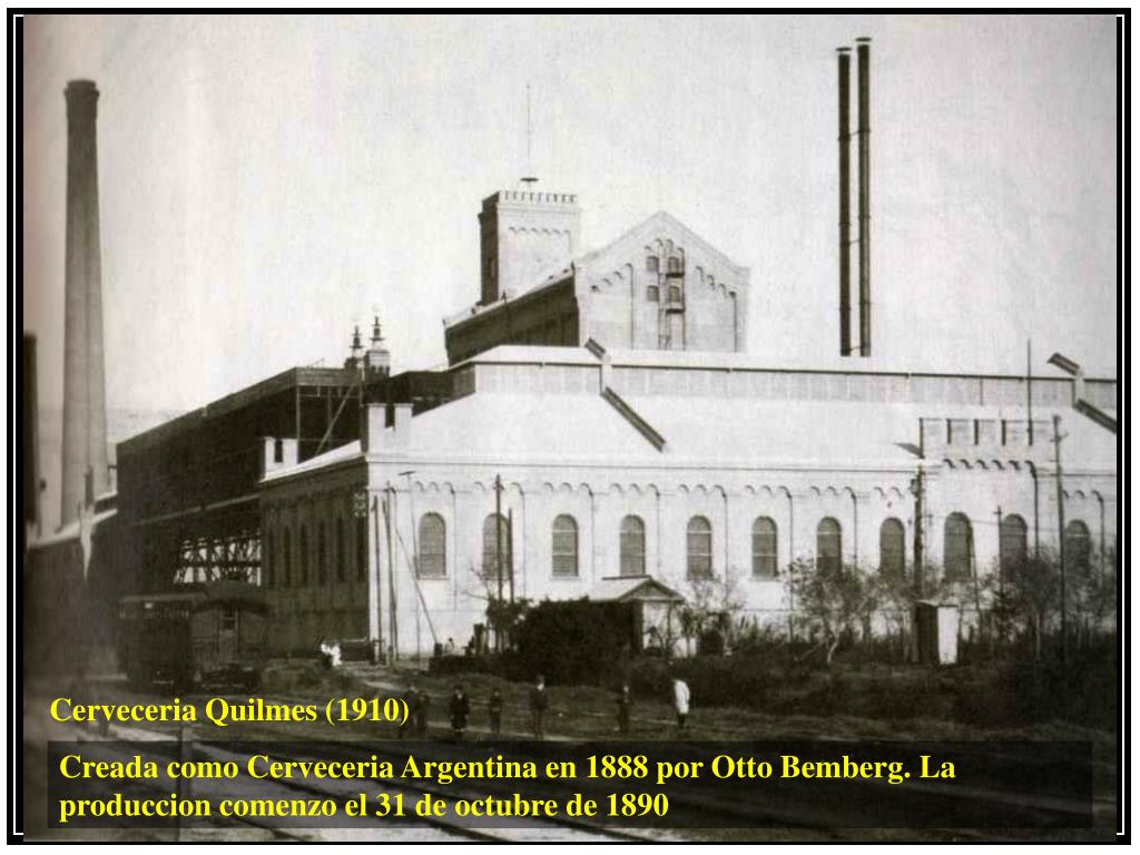 Cerveceria Quilmes (1910) Creada como Cerveceria Argentina en 1888 por Otto Bemberg. La produccion comenzo el 31 de octubre de 1890