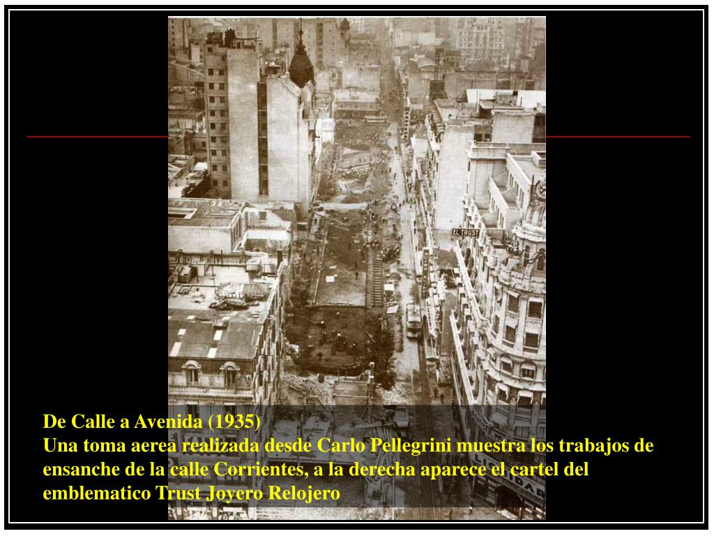 De Calle a Avenida (1935) Una toma aerea realizada desde Carlo Pellegrini muestra los trabajos de ensanche de la calle Corrientes, a la derecha aparece el cartel del emblematico Trust Joyero Relojero