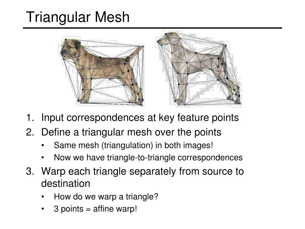 Triangular Mesh • Input correspondences at key feature points • Define a triangular mesh over the points • Same mesh (triangulation) in both images! • Now we have triangle-to-triangle correspondences • Warp each triangle separately from source to destination • How do we warp a triangle? • 3 points = affine warp!