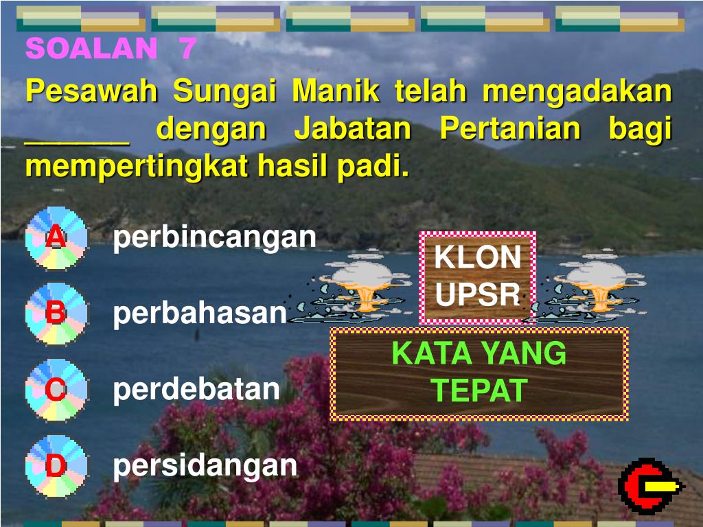 KLON UPSR KATA YANG TEPAT SOALAN 7 Pesawah Sungai Manik telah mengadakan ______ dengan Jabatan Pertanian bagi mempertingkat hasil padi. A perbincangan B perbahasan perdebatan C persidangan D