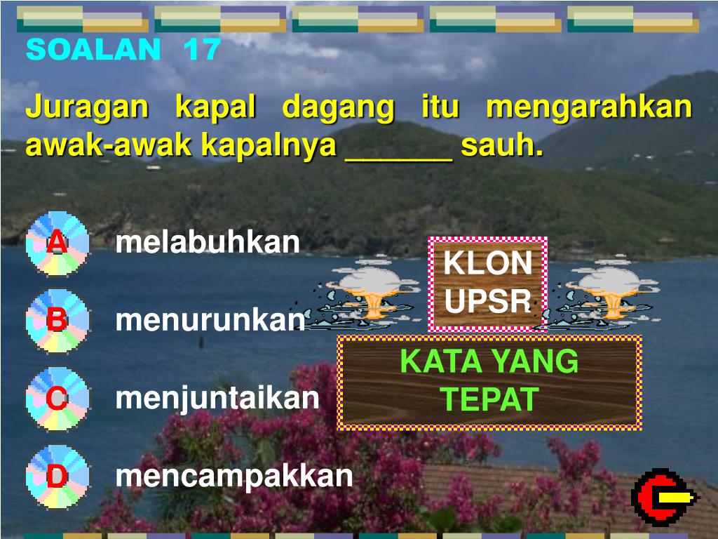 KLON UPSR KATA YANG TEPAT SOALAN 17 Juragan kapal dagang itu mengarahkan awak-awak kapalnya ______ sauh. A melabuhkan B menurunkan menjuntaikan C mencampakkan D