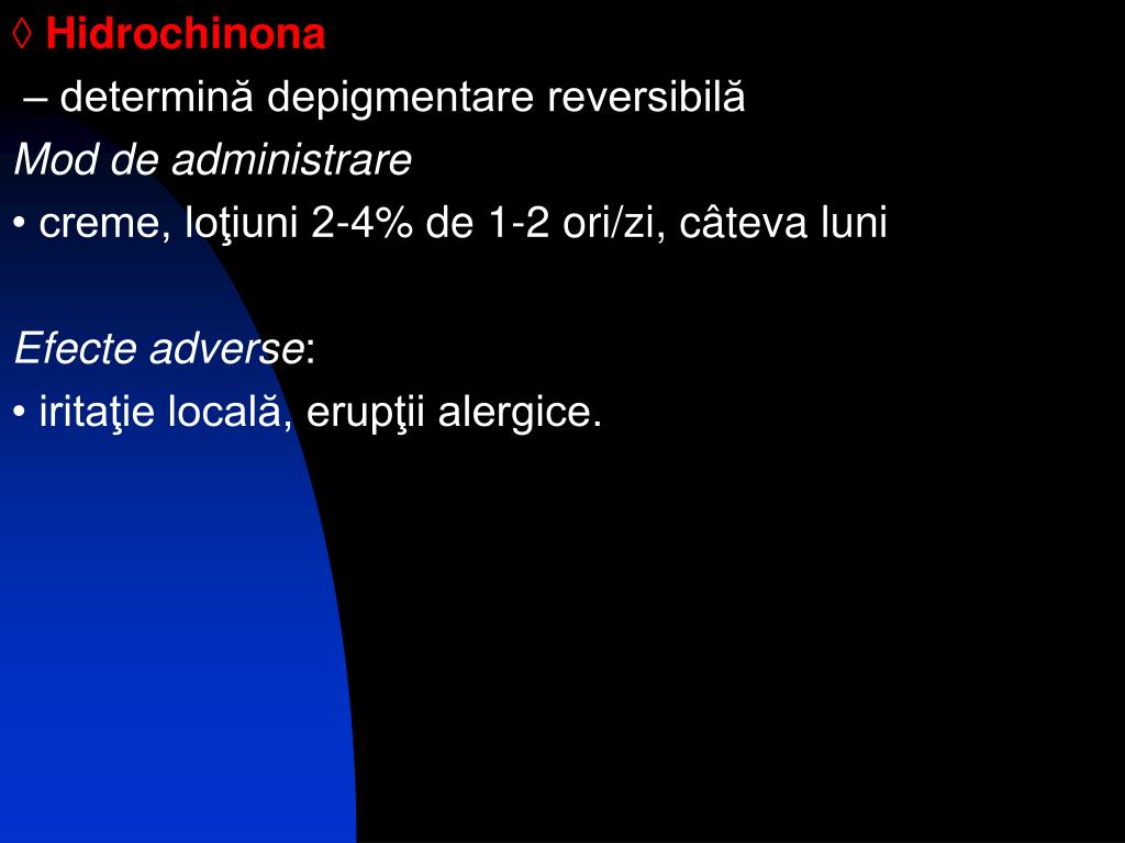 ◊ Hidrochinona – determină depigmentare reversibilă Mod de administrare • creme, loţiuni 2-4% de 1-2 ori/zi, câteva luni Efecte adverse: • iritaţie locală, erupţii alergice.