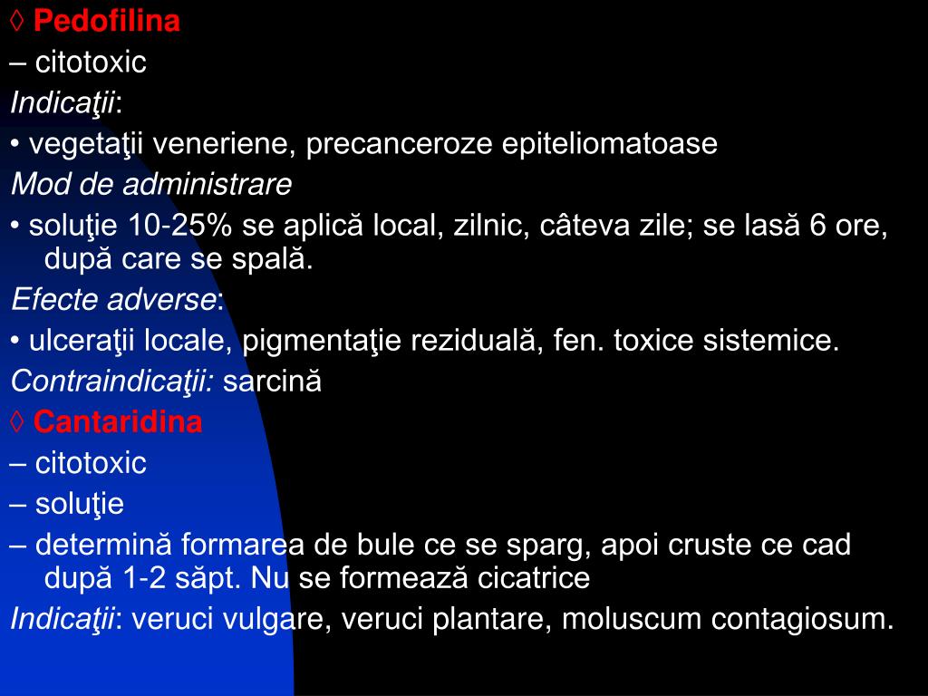 ◊ Pedofilina – citotoxic Indicaţii: • vegetaţii veneriene, precanceroze epiteliomatoase Mod de administrare • soluţie 10-25% se aplică local, zilnic, câteva zile; se lasă 6 ore, după care se spală. Efecte adverse: • ulceraţii locale, pigmentaţie reziduală, fen. toxice sistemice. Contraindicaţii: sarcină ◊ Cantaridina – citotoxic – soluţie – determină formarea de bule ce se sparg, apoi cruste ce cad după 1-2 săpt. Nu se formează cicatrice Indicaţii: veruci vulgare, veruci plantare, moluscum contagiosum.