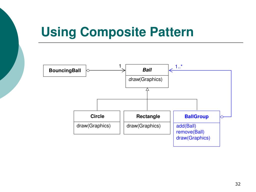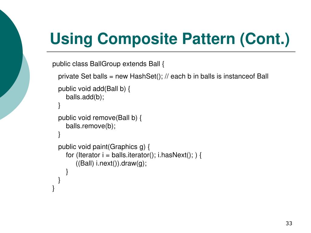 Using Composite Pattern (Cont.) public class BallGroup extends Ball { private Set balls = new HashSet(); // each b in balls is instanceof Ball public void add(Ball b) { balls.add(b); } public void remove(Ball b) { balls.remove(b); } public void paint(Graphics g) { for (Iterator i = balls.iterator(); i.hasNext(); ) { ((Ball) i.next()).draw(g); } } }