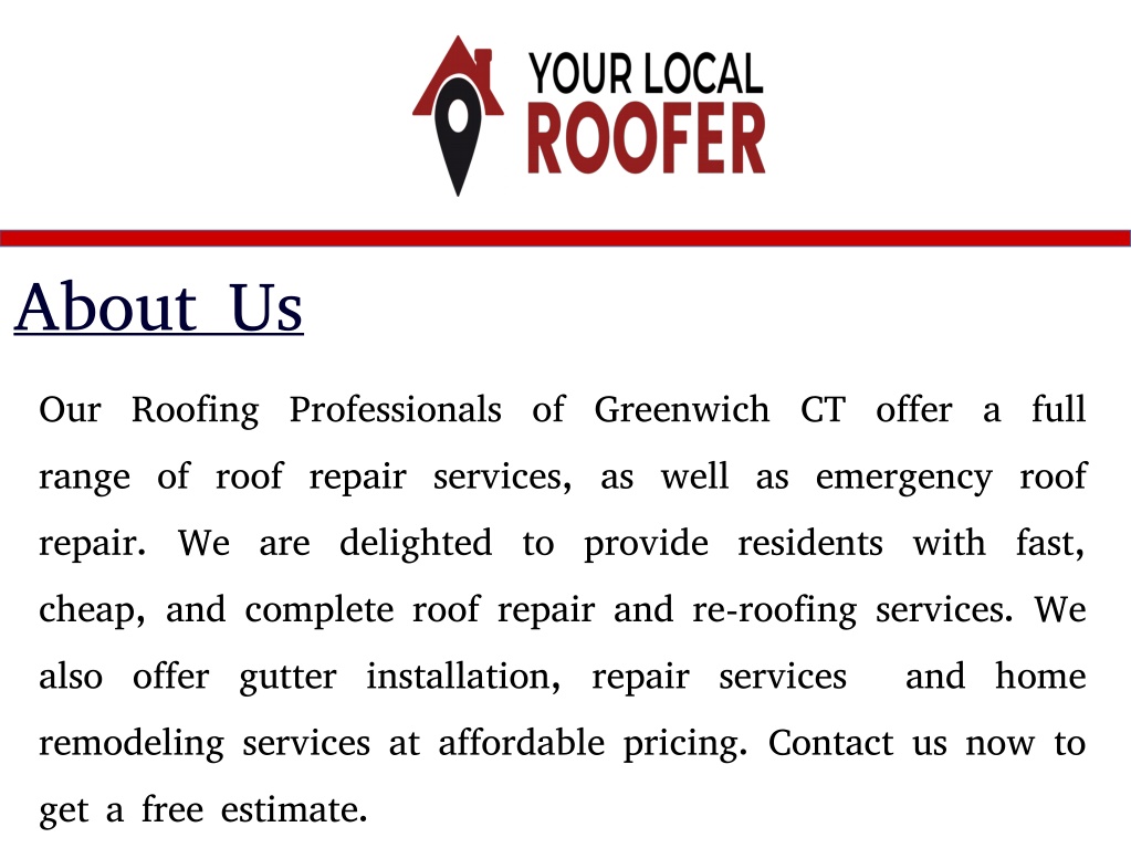 About Us Our Roofing Professionals of Greenwich CT offer a full range of roof repair services, as well as emergency roof repair. We are delighted to provide residents with fast, cheap, and complete roof repair and re-roofing services. We also offer gutter installation, repair services and home remodeling services at affordable pricing. Contact us now to get a free estimate.