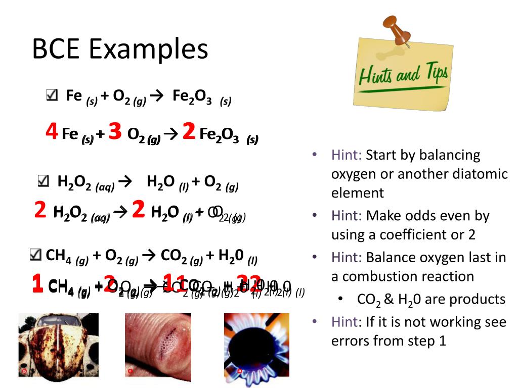 BCE Examples • Fe (s) + O2 (g) → Fe2O3(s) Hint: Start by balancing oxygen or another diatomic element Hint: Make odds even by using a coefficient or 2 Hint: Balance oxygen last in a combustion reaction CO2 & H20 are products Hint: If it is not working see errors from step 1 4 Fe (s) + 3 O2 (g) → 2 Fe2O3(s) Fe (s) + O2 (g) → 2 Fe2O3(s) Fe (s) + 3 O2 (g) → 2 Fe2O3(s) • H2O2(aq) → H2O (l) + O2(g) H2O2(aq) → 2H2O (l) + O2(g) 2 H2O2(aq) → 2 H2O (l) + O2(g) • CH4(g) + O2 (g) → CO2 (g)+ H20 (l) 1 CH4(g) + O2 (g) → 1 CO2 (g)+ H20 (l) 1 CH4(g) + O2 (g) → 1 CO2 (g)+ 2 H20 (l) 1 CH4(g) +2 O2 (g) → 1CO2 (g)+ 2 H20 (l) 1 CH4(g) + O2 (g) → CO2 (g)+ H20 (l)