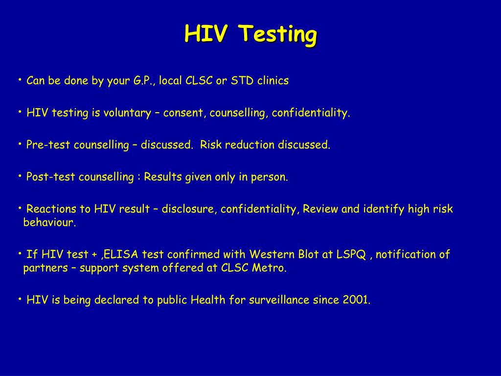 HIV Testing Can be done by your G.P., local CLSC or STD clinics HIV testing is voluntary – consent, counselling, confidentiality. Pre-test counselling – discussed. Risk reduction discussed. Post-test counselling : Results given only in person. Reactions to HIV result – disclosure, confidentiality, Review and identify high risk behaviour. If HIV test + ,ELISA test confirmed with Western Blot at LSPQ , notification of partners – support system offered at CLSC Metro. HIV is being declared to public Health for surveillance since 2001.