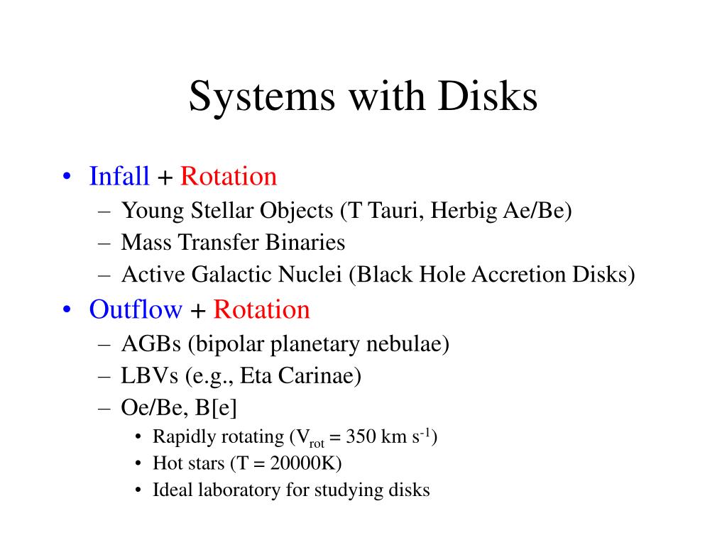 Systems with Disks • Infall + Rotation • Young Stellar Objects (T Tauri, Herbig Ae/Be) • Mass Transfer Binaries • Active Galactic Nuclei (Black Hole Accretion Disks) • Outflow + Rotation • AGBs (bipolar planetary nebulae) • LBVs (e.g., Eta Carinae) • Oe/Be, B[e] • Rapidly rotating (Vrot = 350 km s-1) • Hot stars (T = 20000K) • Ideal laboratory for studying disks
