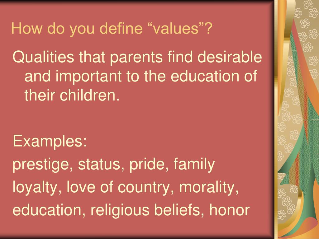 How do you define “values”? Qualities that parents find desirable and important to the education of their children. Examples: prestige, status, pride, family loyalty, love of country, morality, education, religious beliefs, honor