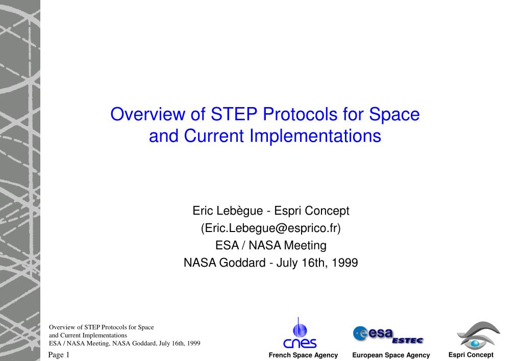 Overview of STEP Protocols for Spaceand Current Implementations Eric Lebègue - Espri Concept (Eric.Lebegue@esprico.fr) ESA / NASA Meeting NASA Goddard - July 16th, 1999 Overview of STEP Protocols for Space and Current Implementations ESA / NASA Meeting, NASA Goddard, July 16th, 1999