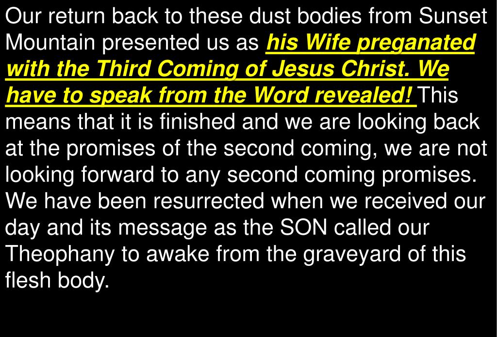 Our return back to these dust bodies from Sunset Mountain presented us as his Wife preganatedwith the Third Coming of Jesus Christ. We have to speak from the Word revealed! This means that it is finished and we are looking back at the promises of the second coming, we are not looking forward to any second coming promises. We have been resurrected when we received our day and its message as the SON called our Theophany to awake from the graveyard of this flesh body.