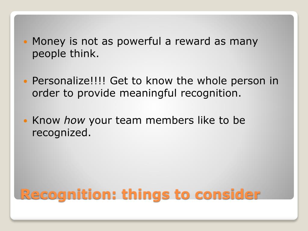 Money is not as powerful a reward as many people think. • Personalize!!!! Get to know the whole person in order to provide meaningful recognition. • Know how your team members like to be recognized. Recognition: things to consider