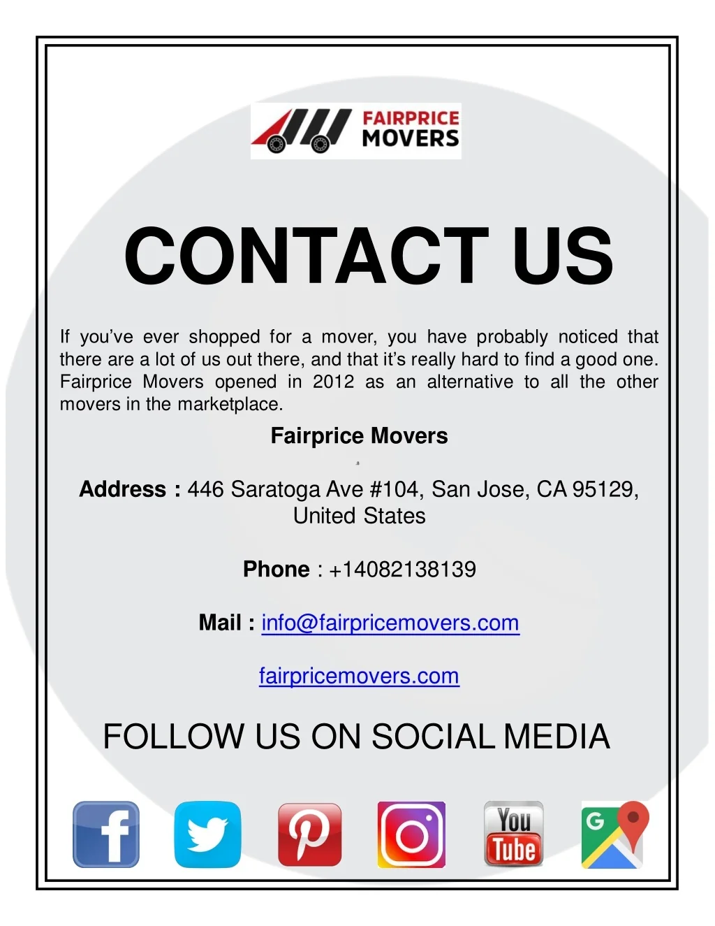 CONTACT US If you’ve ever shopped for a mover, you have probably noticed that there are a lot of us out there, and that it’s really hard to find a good one. Fairprice Movers opened in 2012 as an alternative to all the other movers in the marketplace. Fairprice Movers .8 Address : 446 Saratoga Ave #104, San Jose, CA 95129, United States Phone : +14082138139 Mail : info@fairpricemovers.com fairpricemovers.com FOLLOW US ON SOCIAL MEDIA