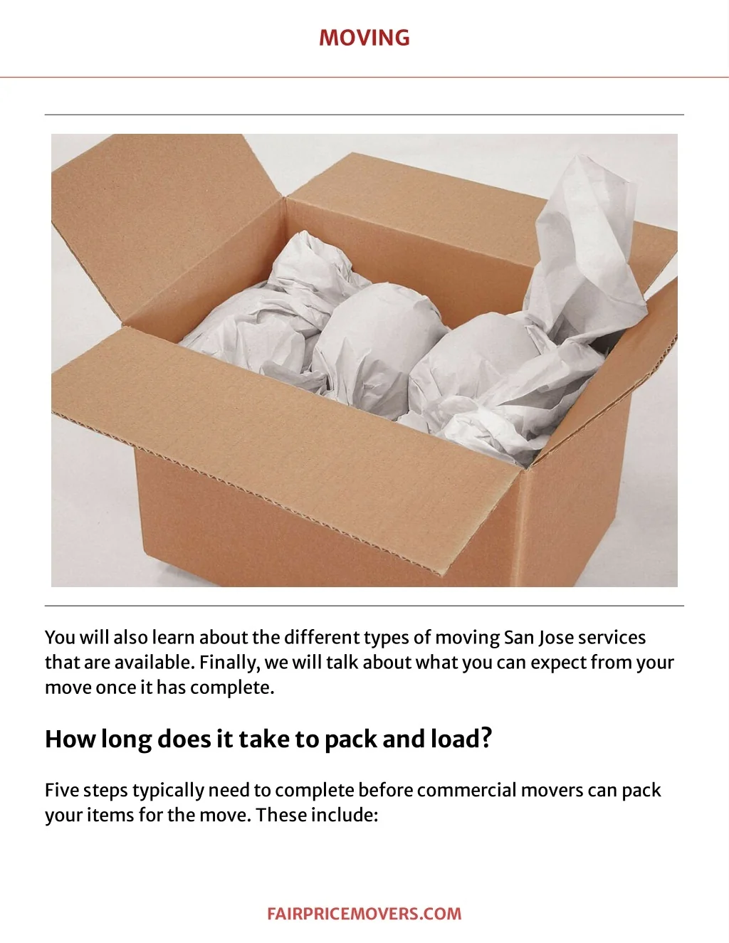MO VING Y ouwillalsolearnaboutt hedi?erentt ypesofmovingSanJoseservices t hatareavailable.F inally ,wewillt alkaboutwhatyoucanexpectfromyour moveonceithascomplet e. Howlongdoesittaketop ackandload? F ivest epst ypicallyneedt ocomplet ebeforecommercialmoverscanpack yourit emsfort hemove.Theseinclude: F A IR PR IC EMOVER S . C OM
