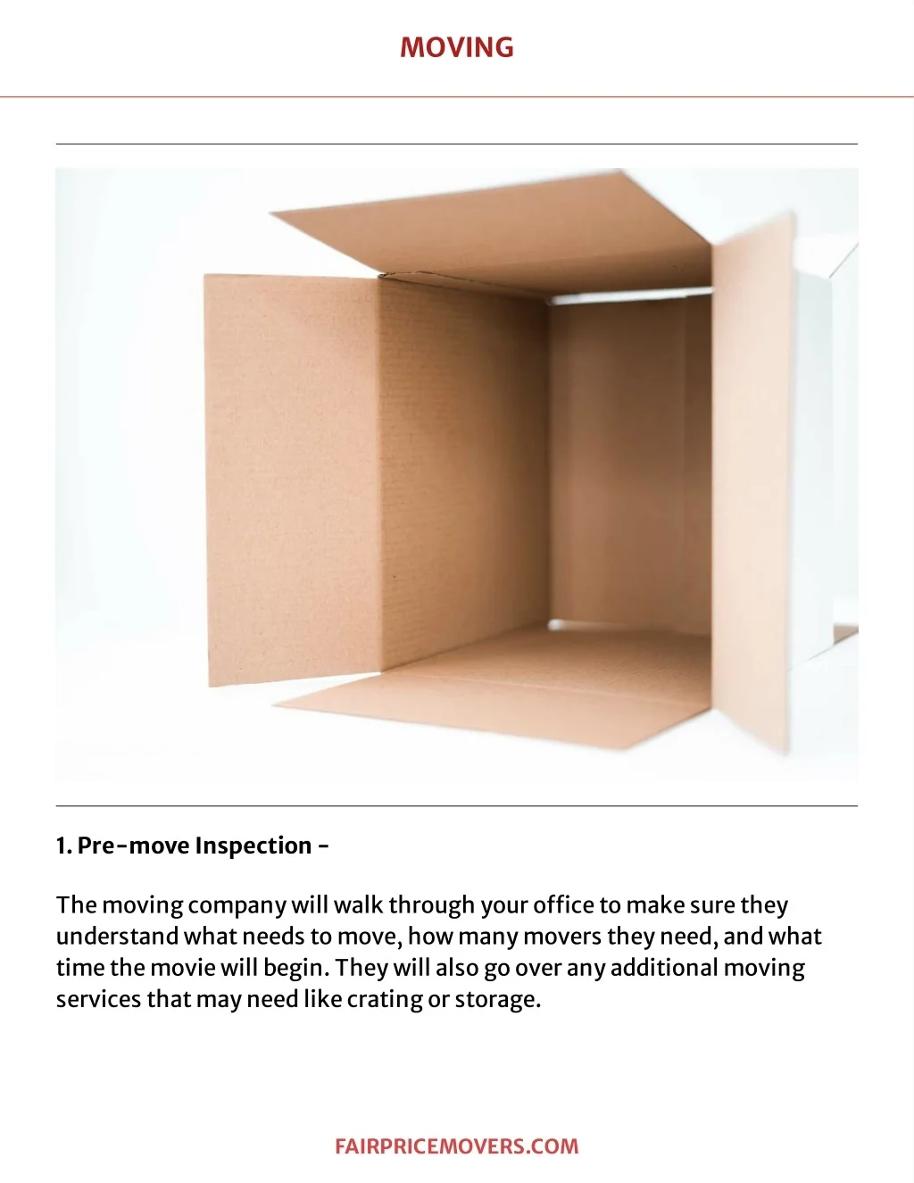 MO VING 1.Pre -mov eInspe ction- Themovingcompanywillwalkt hroughyouro?cet omak esuret hey underst andwhatneedst omove,howmanymoverst heyneed,andwhat t imet hemoviewillbegin.Theywillalsogooveranyaddit ionalmoving servicest hatmayneedlik ecrat ingorst orage. F A IR PR IC EMOVER S . C OM