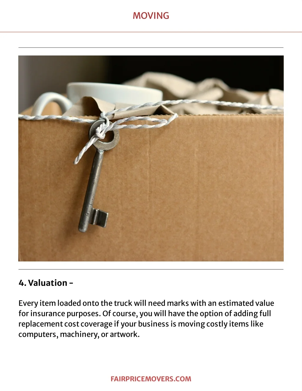 MOVING 4.V aluatio n- Everyit emloadedont ot het ruckwillneedmark swit hanest imat edvalue forinsurancepurposes.Ofcourse,youwillhavet heopt ionofaddingfull replacementcostcoverageifyourbusinessismovingcost lyit emslik e comput ers,machinery ,orart work . F A IR PR IC EMOVER S . C OM