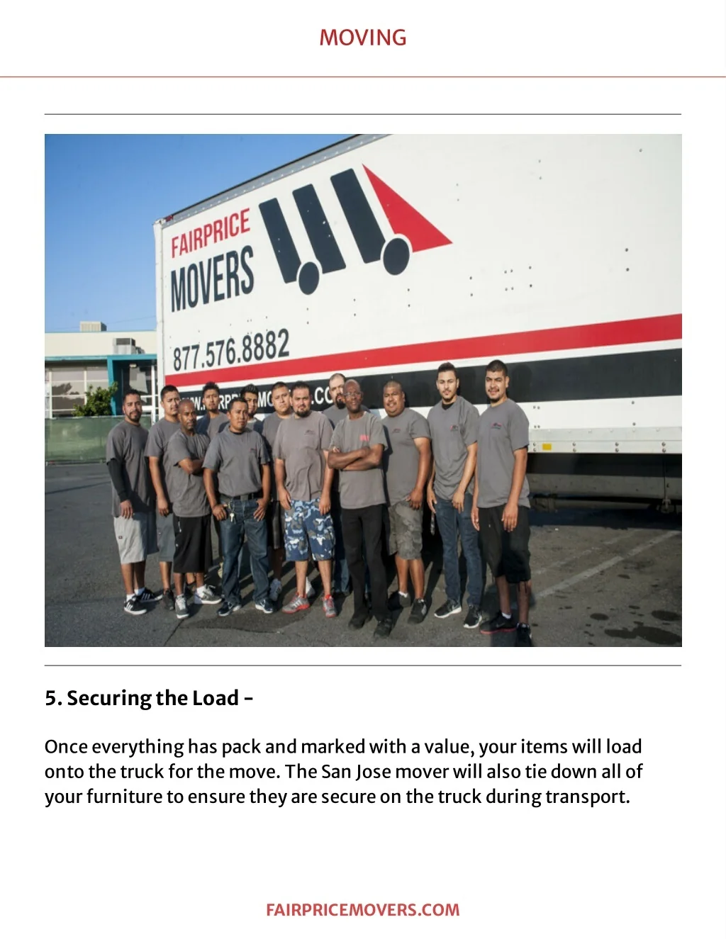 MOVING 5.SecuringtheLo ad- Onceeveryt hinghaspackandmark edwit havalue,yourit emswillload ont ot het ruckfort hemove.TheSanJosemoverwillalsot iedownallof yourfurnit uret oensuret heyaresecureont het ruckduringt ransport . F A IR PR IC EMOVER S . C OM