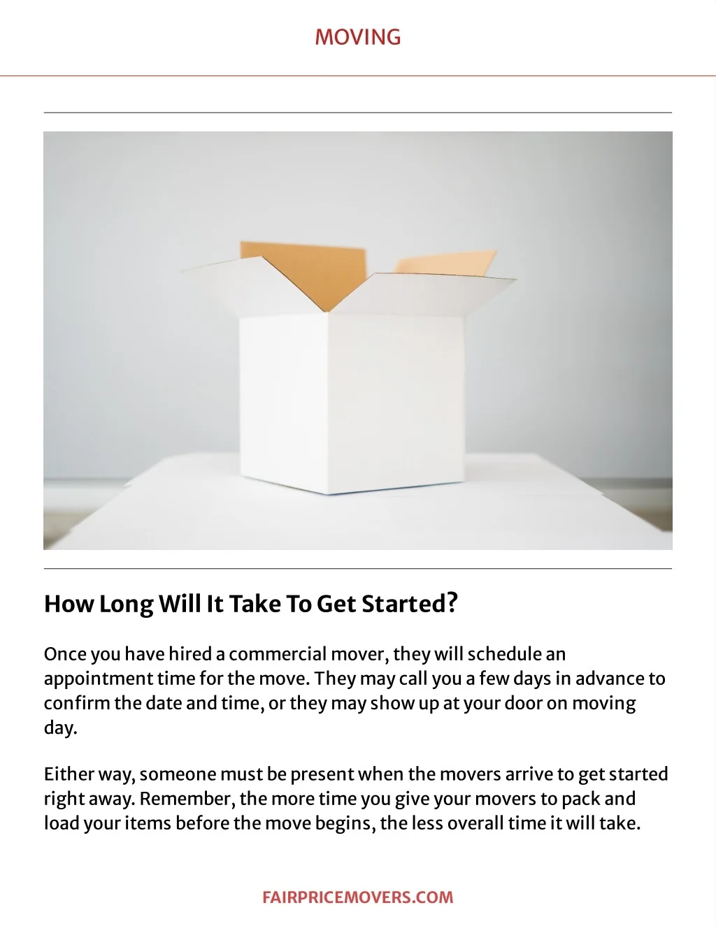 MOVING HowL ongWillItT akeT oGetStarted? Onceyouhavehiredacommercialmover,t heywillschedulean appoint mentt imefort hemove.Theymaycallyouafewdaysinadvancet o con?rmt hedat eandt ime,ort heymayshowupatyourdooronmoving day . Eit herway ,someonemustbepresentwhent hemoversarrivet ogetst art ed rightaway .Remember,t hemoret imeyougiveyourmoverst opackand loadyourit emsbeforet hemovebegins,t helessoverallt imeitwillt ak e. F A IR PR IC EMOVER S . C OM