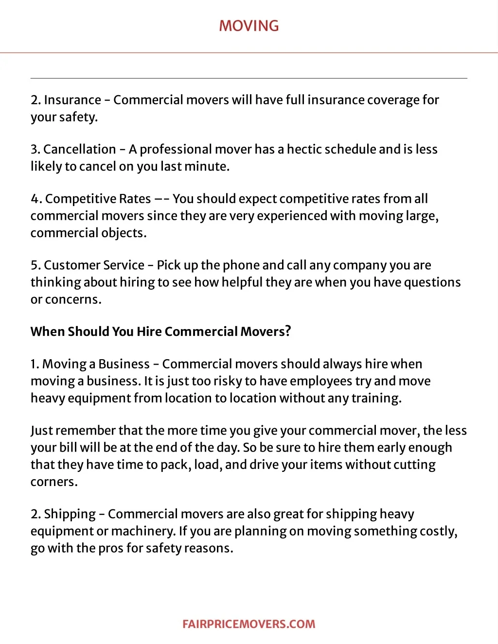 MOVING 2.I nsurance-Commercialmoverswillhavefullinsurancecoveragefor yoursafet y . 3.Cancellat ion-Aprofessionalmoverhasahect icscheduleandisless lik elyt ocancelonyoulastminut e. 4 .Compet it iveRat es– -Y oushouldexpectcompet it iverat esfromall commercialmoverssincet heyareveryexperiencedwit hmovinglarge, commercialobject s. 5.Cust omerService-P ickupt hephoneandcallanycompanyyouare t hink ingabouthiringt oseehowhelpfult heyarewhenyouhavequest ions orconcerns. Whe nShouldY ouH ireComme rcialMov e rs? 1.MovingaBusiness-Commercialmoversshouldalwayshirewhen movingabusiness.I tisjustt oorisk yt ohaveemployeest ryandmove heavyequipmentfromlocat iont olocat ionwit houtanyt raining. Justremembert hatt hemoret imeyougiveyourcommercialmover,t heless yourbillwillbeatt heendoft heday .Sobesuret ohiret hemearlyenough t hatt heyhavet imet opack ,load,anddriveyourit emswit houtcut t ing corners. 2.Shipping-Commercialmoversarealsogreatforshippingheavy equipmentormachinery .I fyouareplanningonmovingsomet hingcost ly , gowit ht heprosforsafet yreasons. F A IR PR IC EMOVER S . C OM
