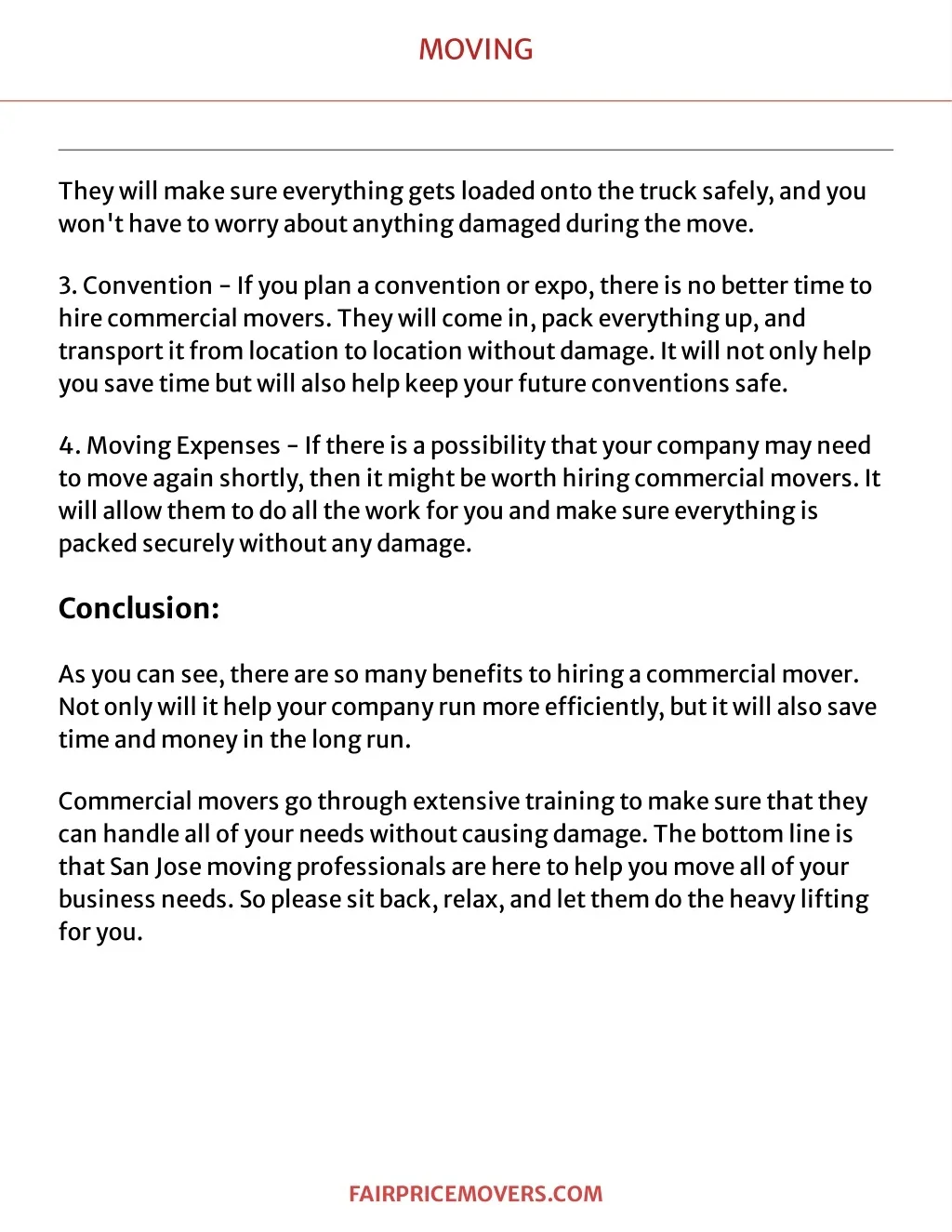 MOVING Theywillmak esureeveryt hingget sloadedont ot het rucksafely ,andyou won' thavet oworryaboutanyt hingdamagedduringt hemove. 3.Convent ion-I fyouplanaconvent ionorexpo,t hereisnobet t ert imet o hirecommercialmovers.Theywillcomein,packeveryt hingup,and t ransportitfromlocat iont olocat ionwit houtdamage.I twillnotonlyhelp yousavet imebutwillalsohelpk eepyourfut ureconvent ionssafe. 4 .MovingExpenses-I ft hereisapossibilit yt hatyourcompanymayneed t omoveagainshort ly ,t henitmightbewort hhiringcommercialmovers.I t willallowt hemt odoallt heworkforyouandmak esureeveryt hingis pack edsecurelywit houtanydamage. Con clusion : Asyoucansee,t herearesomanybene?t st ohiringacommercialmover. Notonlywillithelpyourcompanyrunmoree?cient ly ,butitwillalsosave t imeandmoneyint helongrun. Commercialmoversgot hroughext ensivet rainingt omak esuret hatt hey canhandleallofyourneedswit houtcausingdamage.Thebot t omlineis t hatSanJosemovingprofessionalsareheret ohelpyoumoveallofyour businessneeds.Sopleasesitback ,relax,andlett hemdot heheavylift ing foryou. F A IR PR IC EMOVER S . C OM