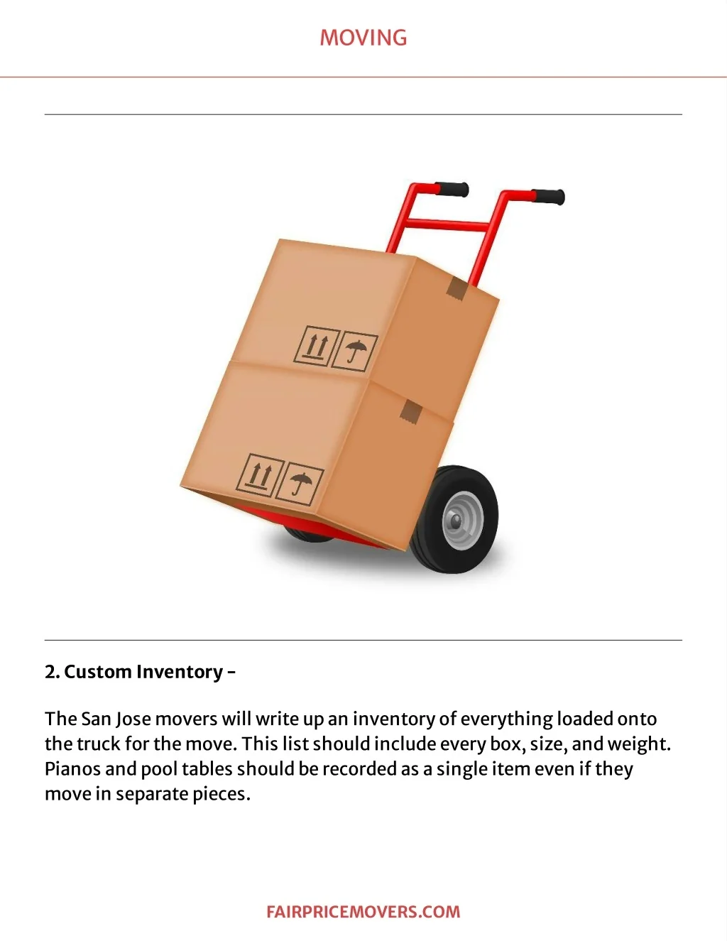 MOVING 2.CustomInv e ntory- TheSanJosemoverswillwrit eupaninvent oryofeveryt hingloadedont o t het ruckfort hemove.Thislistshouldincludeeverybox,size,andweight . P ianosandpoolt ablesshouldberecordedasasingleit emevenift hey moveinseparat epieces. F A IR PR IC EMOVER S . C OM