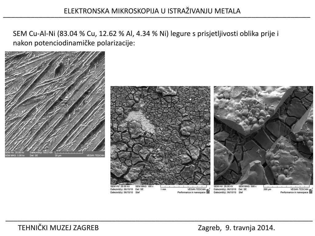 ELEKTRONSKA MIKROSKOPIJA U ISTRAŽIVANJU METALA ______________________________________________________________________________ SEM Cu-Al-Ni (83.04 % Cu, 12.62 % Al, 4.34 % Ni) legure s prisjetljivosti oblika prije i nakon potenciodinamičke polarizacije: ______________________________________________________________________________ TEHNIČKI MUZEJ ZAGREB Zagreb, 9. travnja 2014.