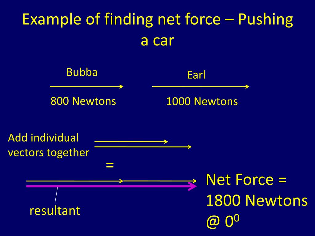Example of finding net force – Pushing a car Bubba Earl 800 Newtons 1000 Newtons Add individual vectors together = Net Force = 1800 Newtons @ 00 resultant