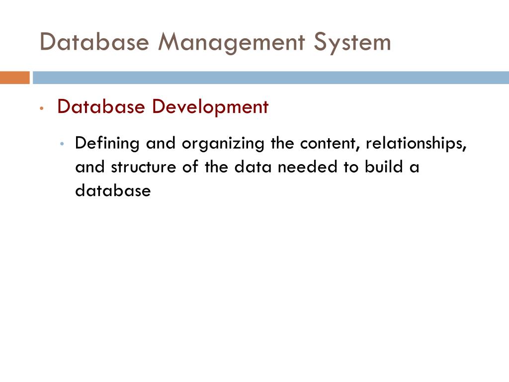 Database Management System • Database Development • Defining and organizing the content, relationships, and structure of the data needed to build a database