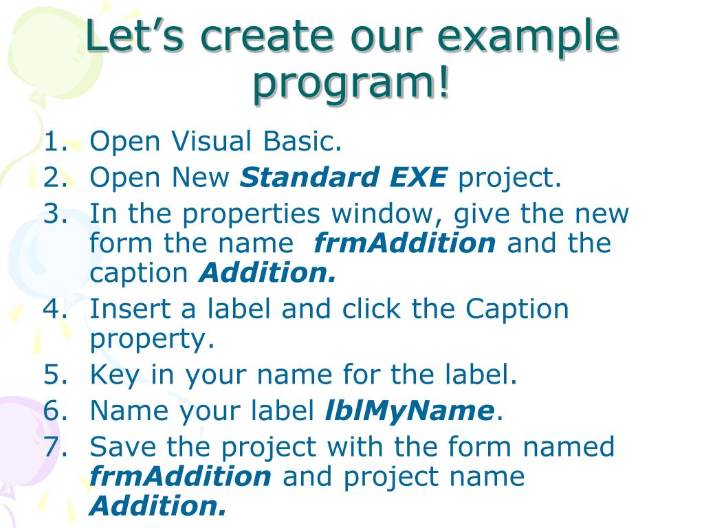 Let’s create our example program! • Open Visual Basic. • Open New Standard EXE project. • In the properties window, give the new form the name frmAddition and the caption Addition. • Insert a label and click the Caption property. • Key in your name for the label. • Name your label lblMyName. • Save the project with the form named frmAddition and project name Addition.