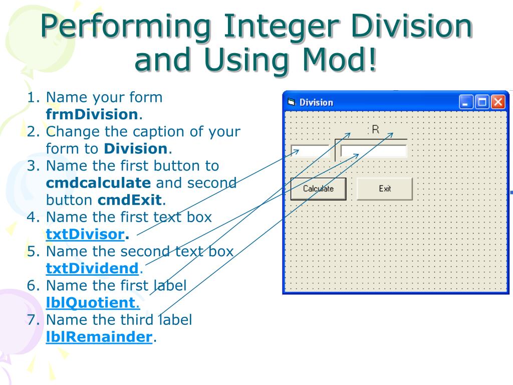 Performing Integer Division and Using Mod! Name your form frmDivision. Change the caption of your form to Division. Name the first button to cmdcalculate and second button cmdExit. Name the first text box txtDivisor. Name the second text box txtDividend. Name the first label lblQuotient. Name the third label lblRemainder.