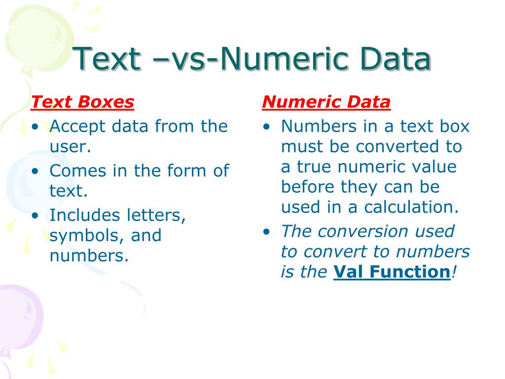 Text Boxes Accept data from the user. Comes in the form of text. Includes letters, symbols, and numbers. Numeric Data Numbers in a text box must be converted to a true numeric value before they can be used in a calculation. The conversion used to convert to numbers is the Val Function! Text –vs-Numeric Data