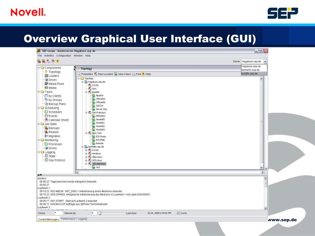 The Value Proposition • No One Backs up Novell and Linux better and more economically than SEP. • NetWare to OES 2 Migration – Made Easy! • NSS volumes, single file backup and recovery • Complete OES2 and Novell Netware Cluster Support • GroupWise Online, eDirectory (single Brick Restore) www.sep.de