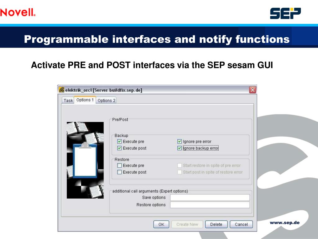 Programmable interfaces and notify functions Activate PRE and POST interfaces via the SEP sesam GUI www.sep.de