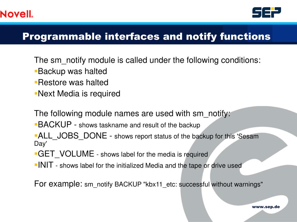 Programmable interfaces and notify functions • The sm_notify module is called under the following conditions: • Backup was halted • Restore was halted • Next Media is required • The following module names are used with sm_notify: • BACKUP -shows taskname and result of the backup • ALL_JOBS_DONE - shows report status of the backup for this 'Sesam Day' • GET_VOLUME - shows label for the media is required • INIT - shows label for the initialized Media and the tape or drive used • For example: sm_notify BACKUP "kbx11_etc: successful without warnings" www.sep.de