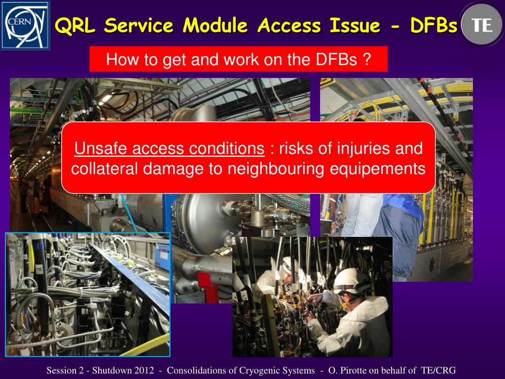 QRL Service Module Access Issue - DFBs How to get and work on the DFBs ? Unsafeaccess conditions : risks of injuries and collateral damage to neighbouringequipements Session 2 - Shutdown 2012 - Consolidations of Cryogenic Systems - O. Pirotte on behalf of TE/CRG