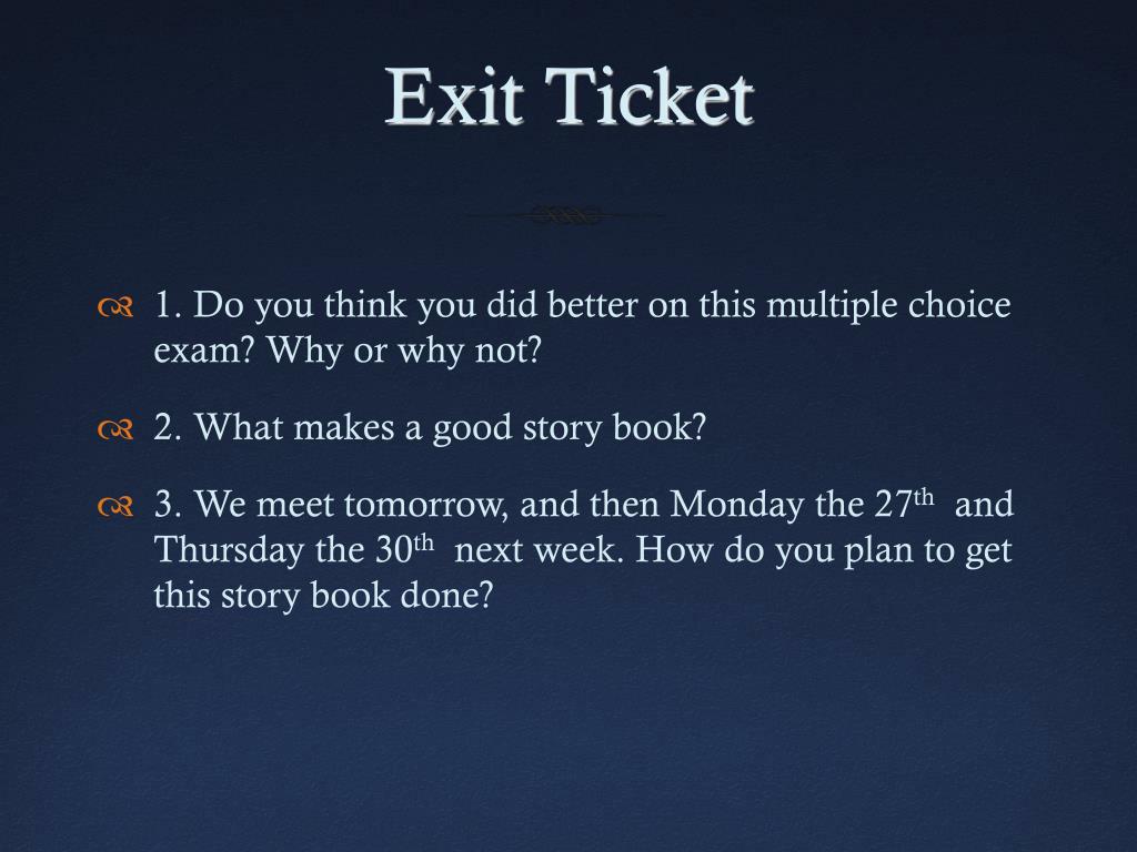 Exit Ticket 1. Do you think you did better on this multiple choice exam? Why or why not? 2. What makes a good story book? 3. We meet tomorrow, and then Monday the 27th and Thursday the 30th next week. How do you plan to get this story book done?