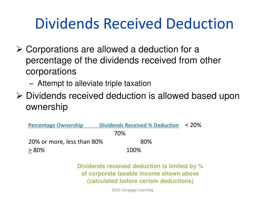Dividends Received Deduction • Corporations are allowed a deduction for a percentage of the dividends received from other corporations • Attempt to alleviate triple taxation • Dividends received deduction is allowed based upon ownership • Percentage Ownership Dividends Received % Deduction < 20% 70% • 20% or more, less than 80% 80% • > 80% 100% • Dividends received deduction is limited by % • of corporate taxable income shown above • (calculated before certain deductions) 2013 Cengage Learning