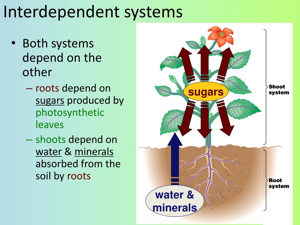 Interdependent systems • Both systems depend on the other • roots depend on sugars produced by photosynthetic leaves • shoots depend on water & minerals absorbed from the soil by roots sugars water &minerals