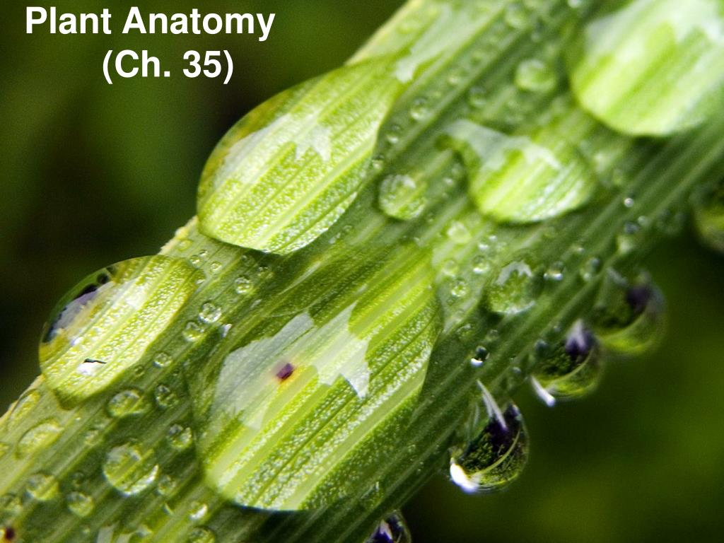 Plant Anatomy (Ch. 35). Basic plant anatomy 1. root root tip root hairs. Roots . 1. Roots anchor plant in soil, absorb minerals & water, & store food fibrous roots (1) mat of thin roots that spread out monocots tap roots (2) 1 large vertical root