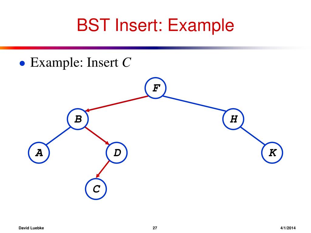 F B H A D K BST Insert: Example • Example: Insert C C David Luebke 274/1/2014