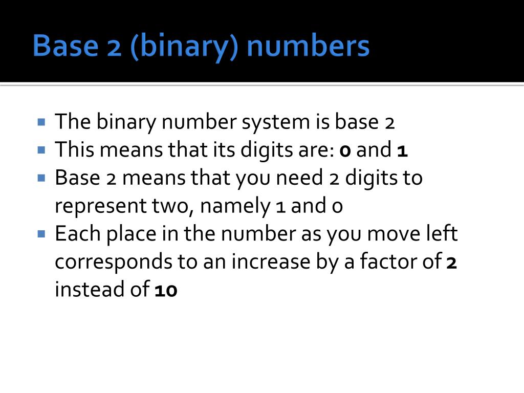 Base 2 (binary) numbers • The binary number system is base 2 • This means that its digits are: 0 and 1 • Base 2 means that you need 2 digits to represent two, namely 1 and 0 • Each place in the number as you move left corresponds to an increase by a factor of 2 instead of 10