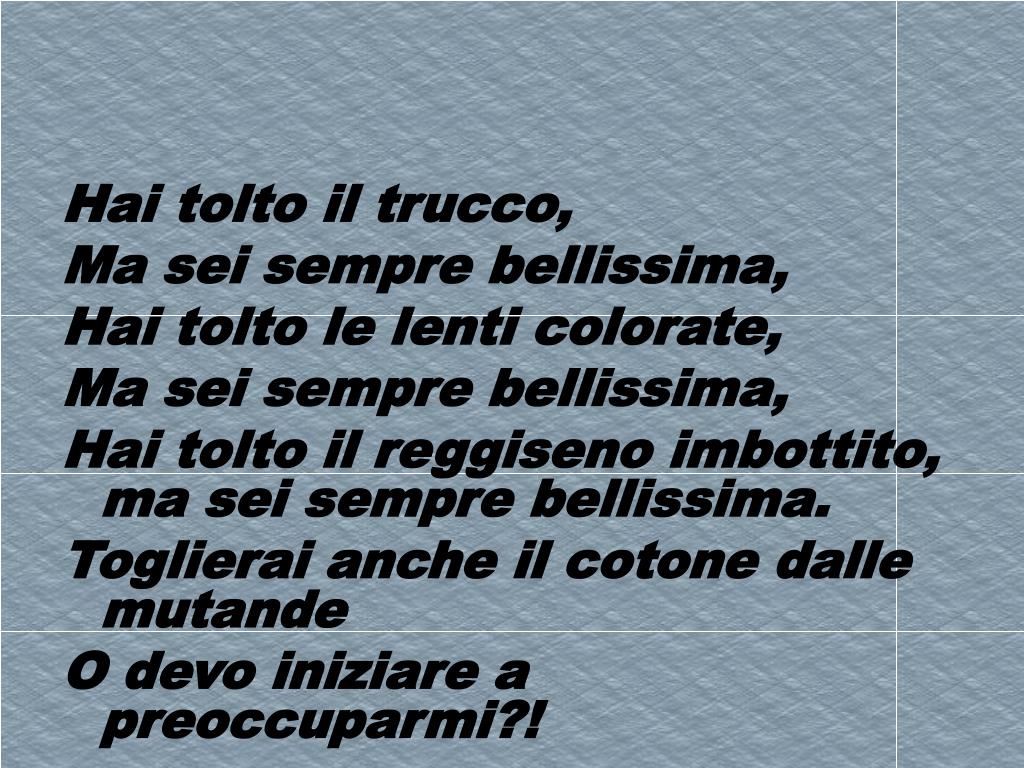 Hai tolto il trucco, Ma sei sempre bellissima, Hai tolto le lenti colorate, Ma sei sempre bellissima, Hai tolto il reggiseno imbottito, ma sei sempre bellissima. Toglierai anche il cotone dalle mutande O devo iniziare a preoccuparmi?!