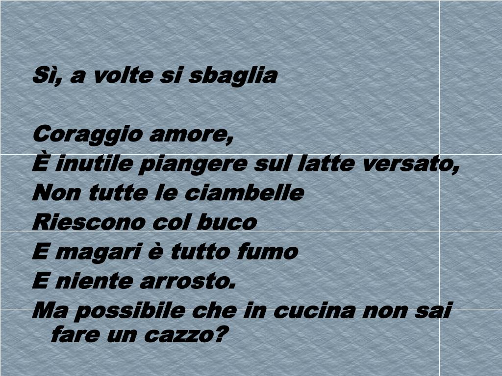 Sì, a volte si sbaglia Coraggio amore, È inutile piangere sul latte versato, Non tutte le ciambelle Riescono col buco E magari è tutto fumo E niente arrosto. Ma possibile che in cucina non sai fare un cazzo?