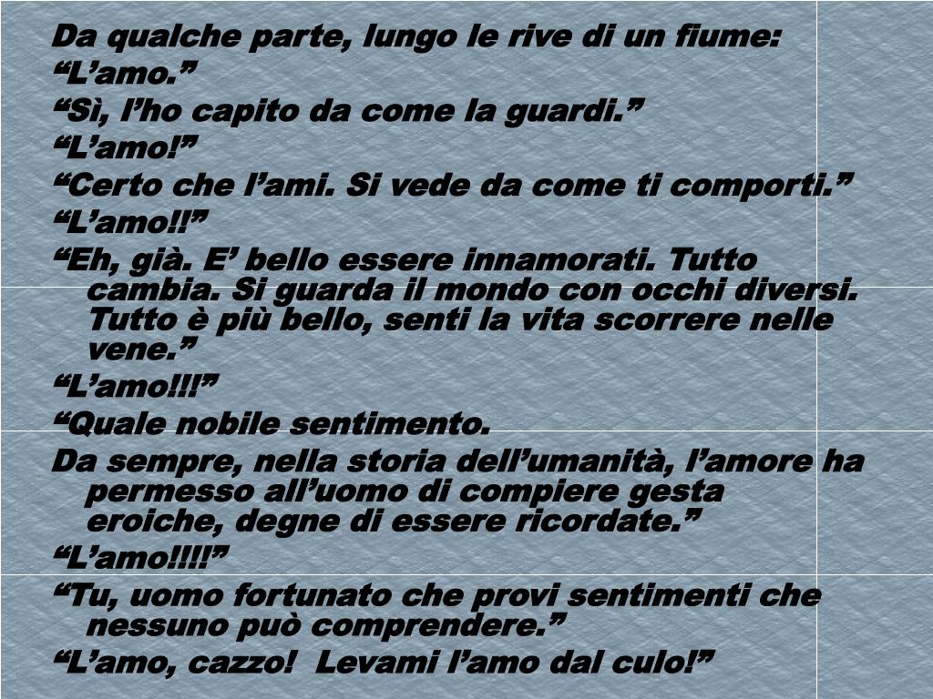 Da qualche parte, lungo le rive di un fiume: “L’amo.” “Sì, l’ho capito da come la guardi.” “L’amo!” “Certo che l’ami. Si vede da come ti comporti.” “L’amo!!” “Eh, già. E’ bello essere innamorati. Tutto cambia. Si guarda il mondo con occhi diversi. Tutto è più bello, senti la vita scorrere nelle vene.” “L’amo!!!” “Quale nobile sentimento. Da sempre, nella storia dell’umanità, l’amore ha permesso all’uomo di compiere gesta eroiche, degne di essere ricordate.” “L’amo!!!!” “Tu, uomo fortunato che provi sentimenti che nessuno può comprendere.” “L’amo, cazzo! Levami l’amo dal culo!”