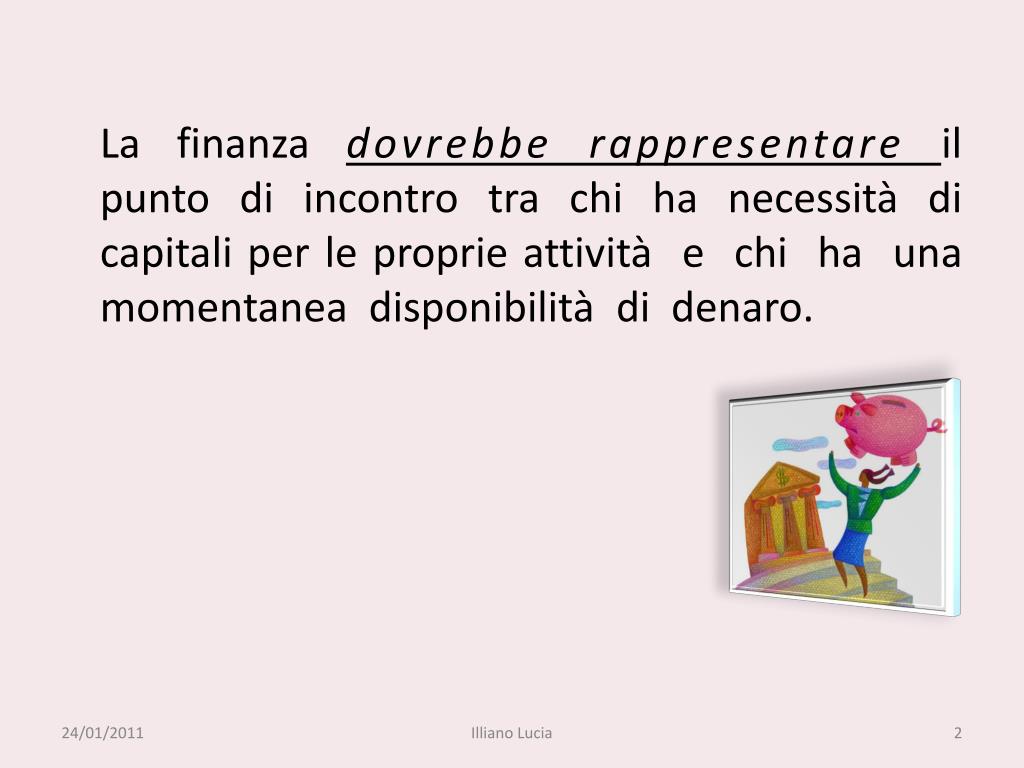 La finanza dovrebbe rappresentare il punto di incontro tra chi ha necessità di capitali per le proprie attività e chi ha una momentanea disponibilità di denaro. Illiano Lucia
