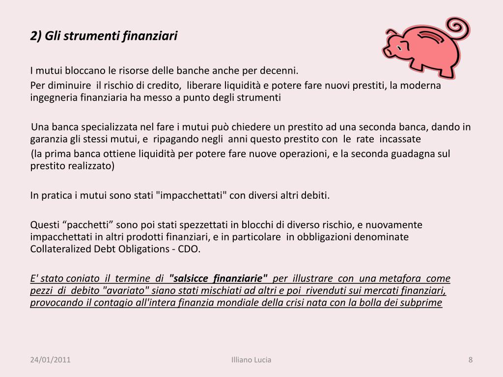 2) Gli strumenti finanziari I mutui bloccano le risorse delle banche anche per decenni. Per diminuire il rischio di credito, liberare liquidità e potere fare nuovi prestiti, la moderna ingegneria finanziaria ha messo a punto degli strumenti Una banca specializzata nel fare i mutui può chiedere un prestito ad una seconda banca, dando in garanzia gli stessi mutui, e ripagando negli anni questo prestito con le rate incassate (la prima banca ottiene liquidità per potere fare nuove operazioni, e la seconda guadagna sul prestito realizzato) In pratica i mutui sono stati "impacchettati" con diversi altri debiti. Questi “pacchetti” sono poi stati spezzettati in blocchi di diverso rischio, e nuovamente impacchettati in altri prodotti finanziari, e in particolare in obbligazioni denominate Collateralized Debt Obligations - CDO. E' stato coniato il termine di "salsicce finanziarie" per illustrare con una metafora come pezzi di debito "avariato" siano stati mischiati ad altri e poi rivenduti sui mercati finanziari, provocando il contagio all'intera finanzia mondiale della crisi nata con la bolla dei subprime Illiano Lucia