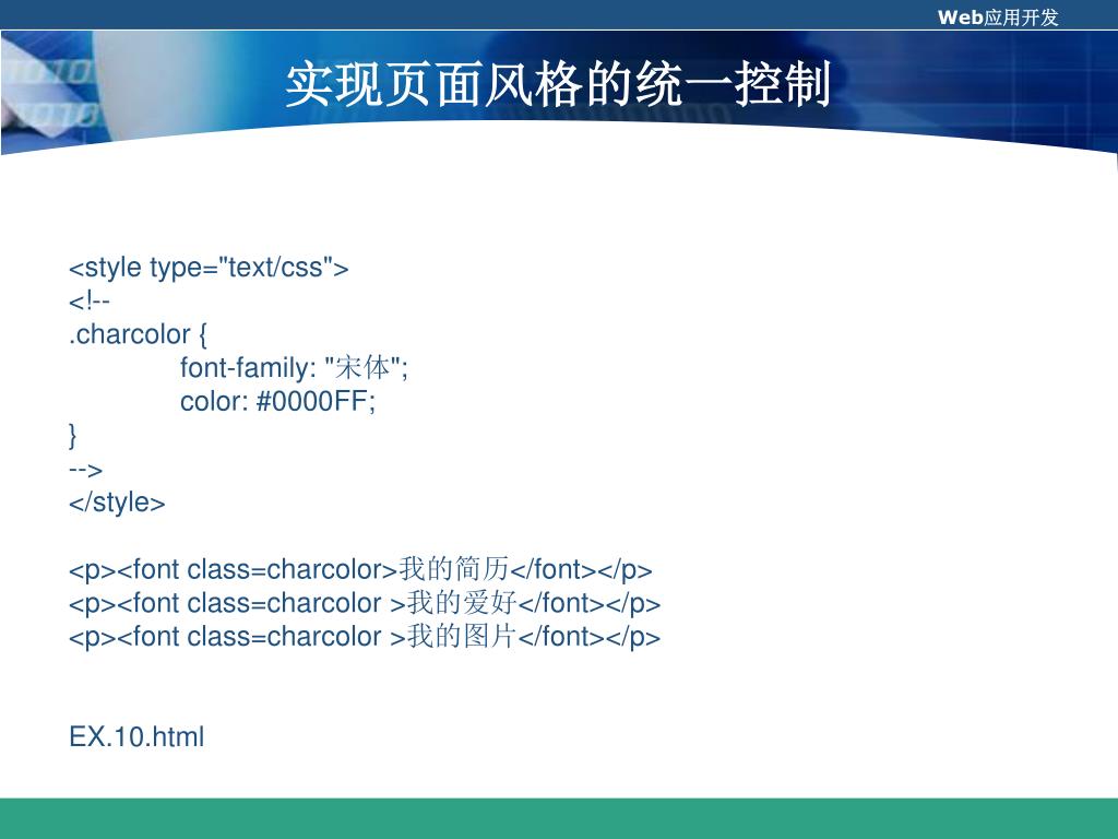 实现页面风格的统一控制 <style type="text/css"> <!-- .charcolor { font-family: "宋体"; color: #0000FF; } --> </style> <p><font class=charcolor>我的简历</font></p> <p><font class=charcolor >我的爱好</font></p> <p><font class=charcolor >我的图片</font></p> EX.10.html
