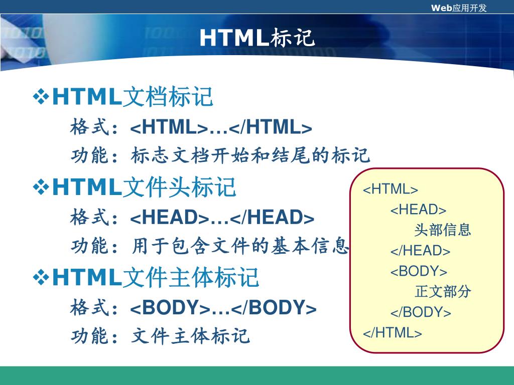 HTML标记 HTML文档标记 格式:<HTML>…</HTML> 功能:标志文档开始和结尾的标记 HTML文件头标记 格式:<HEAD>…</HEAD> 功能:用于包含文件的基本信息 HTML文件主体标记 格式:<BODY>…</BODY> 功能:文件主体标记 <HTML> <HEAD> 头部信息 </HEAD> <BODY> 正文部分 </BODY> </HTML>